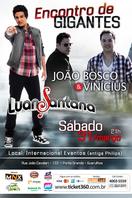 A cidade de Guarulhos definitivamente entra no circuito de grandes eventos do sertanejo universitário, recebendo o “Encontro de Gigantes”, que unirá Luan Santana e João Bosco & Vinicius, artistas de maior sucesso da atualidade.